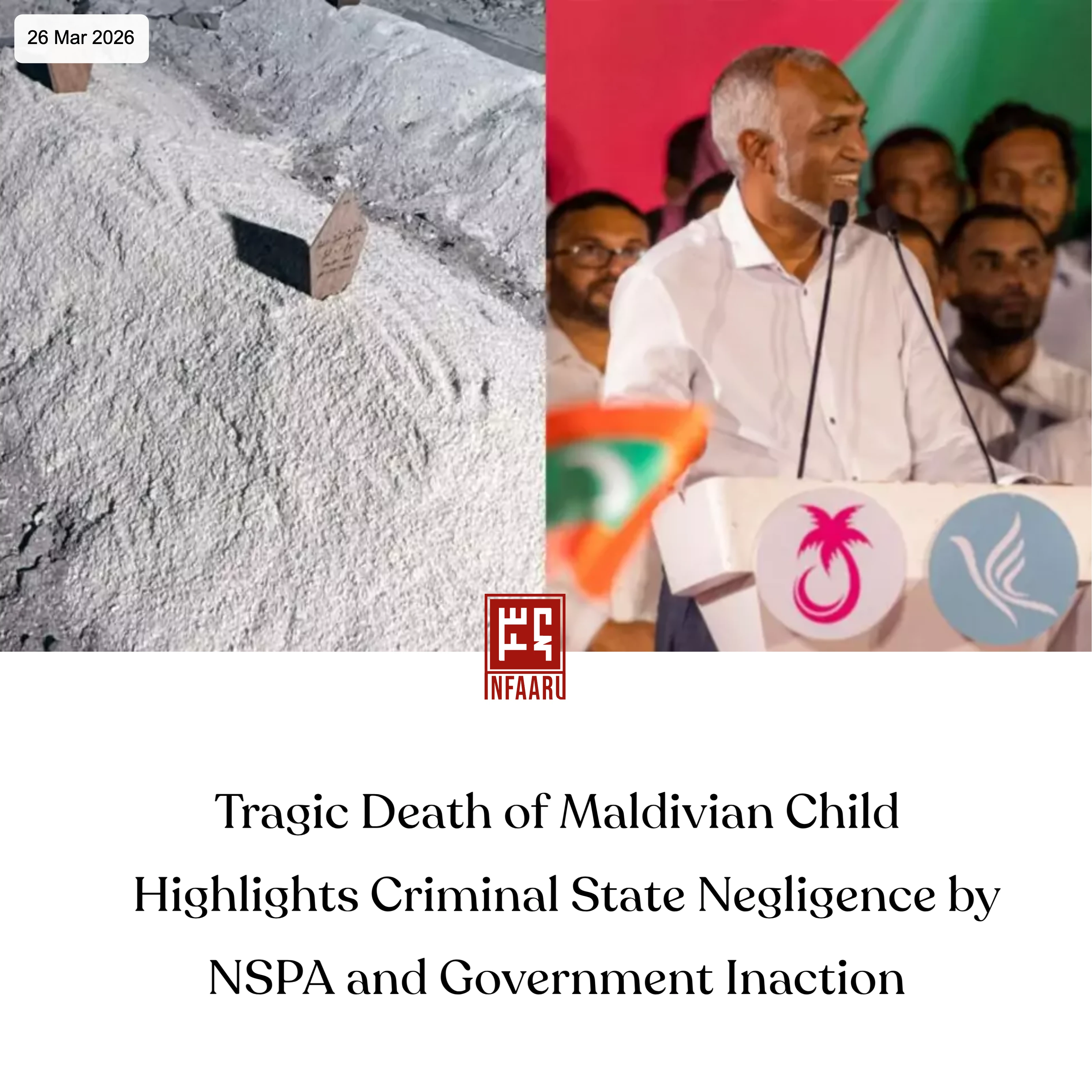 Male’, Maldives – In a devastating case that has shaken public conscience, a young child lost his life after the Maldives’ National Social Protection Agency (NSPA) failed to provide a life-saving medical tube for eight months. The child, known as Azan, passed away on March 25, 2026, despite urgent and repeated appeals from his family and concerned citizens.
