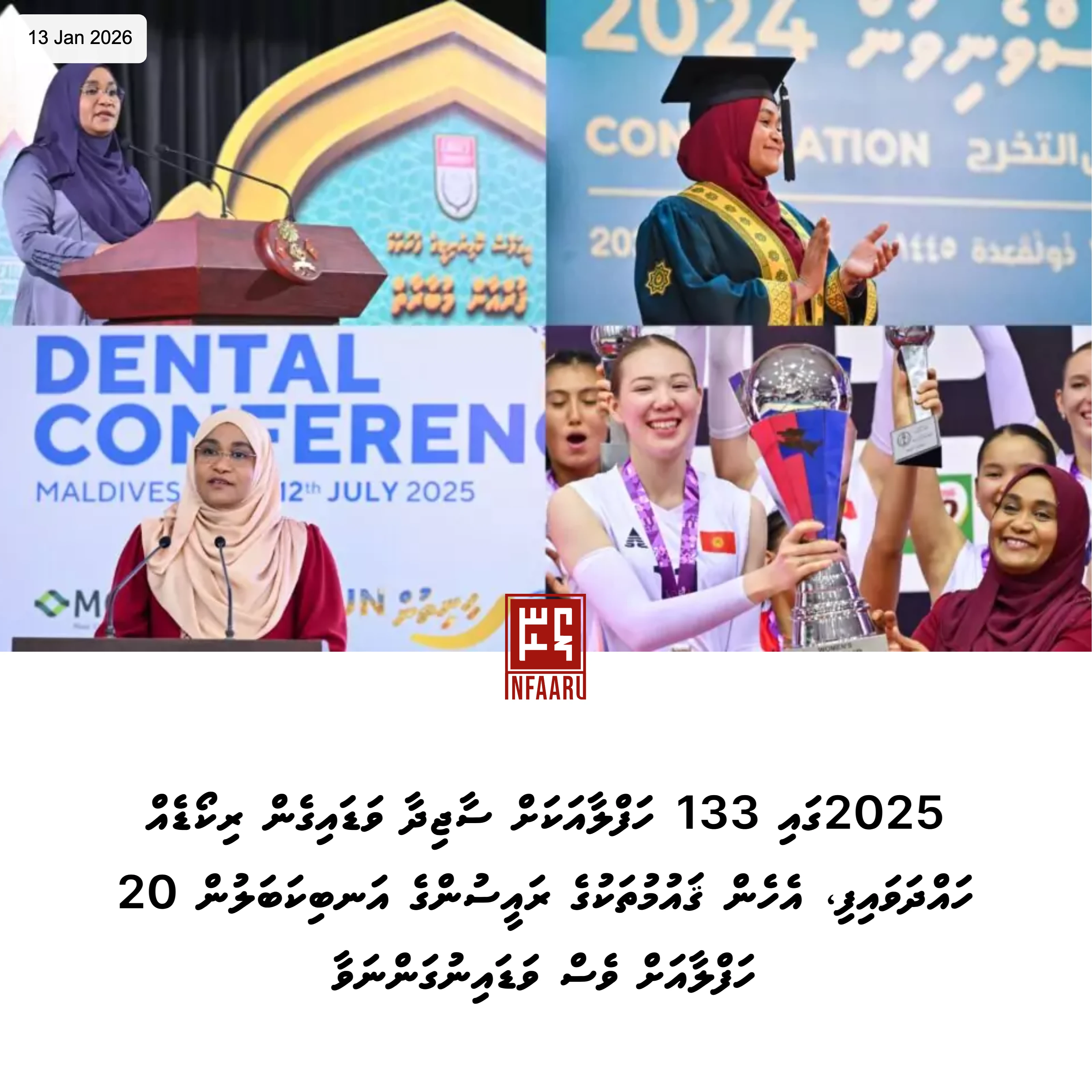2025 ވަނަ އަހަރު ރާއްޖޭގެ ފަސްޓްލޭޑީ ސާޖިދާ މުޙައްމަދު 133 ރަސްމީ ޙަފްލާއެއްގައި ބައިވެރިވެވަޑައިގެންފައި ވާކަން ރިޔާސީ ރަސްމީ ޓްވިޓާ އެކައުންޓުން (@presidencymv) ވާ މަޢުލޫމާތުން ދައްކައެވެ. މިއީ ވަރަށް ބޮޑު އަދަދެކެވެ. ދުނިޔޭގެ އެހެން ޤައުމުތަކަށް ބަލާލާއިރު ރައީސުންގެ އަނބިކަބަލުން ޖުމްލަކޮށް 20 ހަފްލާއަށް ވެސް ވަޑައި ނުގަންނަވައެވެ.